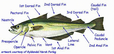 Saltwater fish can have either one or two dorsal fins but some, like the pollack in the example above, have three. Their function is to keep the fish on an even keel when it's swimming, and to assist in making tight turns.